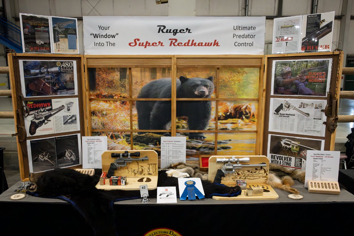 My display, titled "A Window Into The Super Redhawk" is intended to offer a brief Insite as to what was made available and some of the attributes that made the Super Redhawk stand alone. On display are two examples at opposite ends of the spectrum. The first is an early example (2009) of the .480 Ruger in Target Gray finish and a 7.5" barrel. This is the largest caliber ever offered in a Ruger Handgun. The second example is the newest offering (2023) from Ruger in the .22 Hornet cartridge and is the smallest caliber ever offered in the Super Redhawk, or any centerfire Ruger handgun for that matter. It features the satin stainless steel finish and 9" barrel. Each are displayed on Hand crafted wood burned stands featuring scenes depicting the great outdoors. Also featured are examples of factory ammunition, both from the era of introduction of each cartridge, as well as current offerings. Each firearm is represented with advertisements and magazine articles highlighting the Model and including factory "spec sheet" data and production model numbers and years of production.
