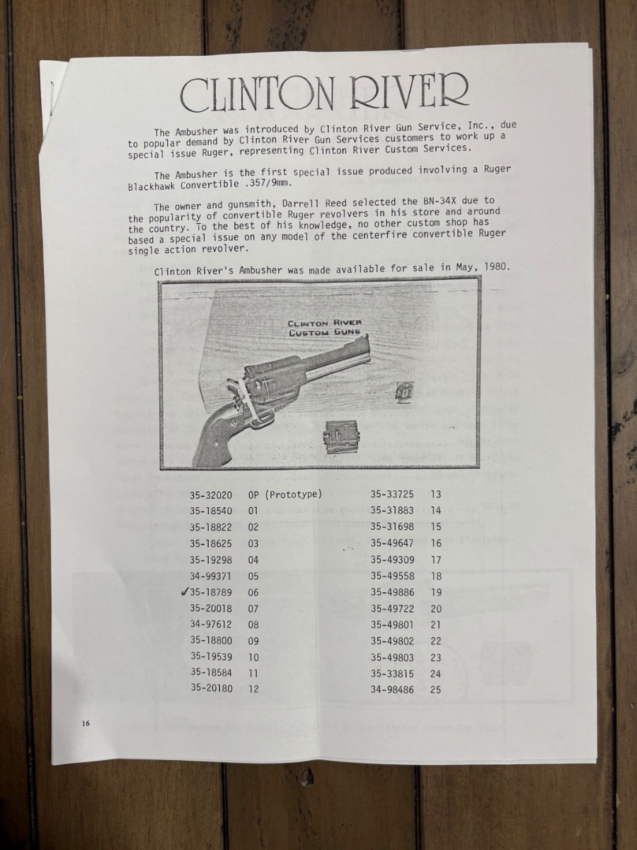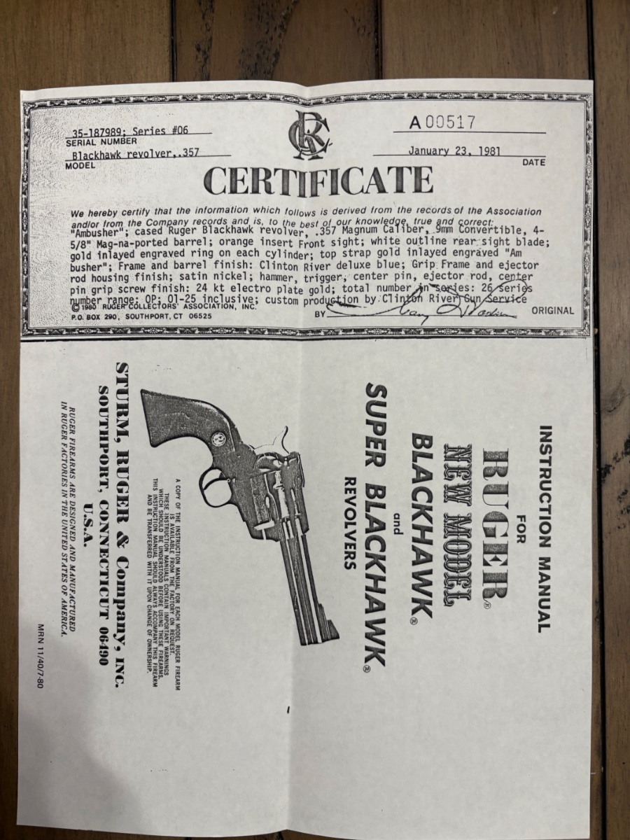I have a New Ruger Blackhawk from 1980. It has had some very nice custom work done by Clinton River Custom Guns. This gun has several 24 carat gold add ons that make it a beautiful gun. It is a convertible.357/.9mm. I have all the paper work showing it is number six out of twenty five. Does anyone have anymore information on these guns?