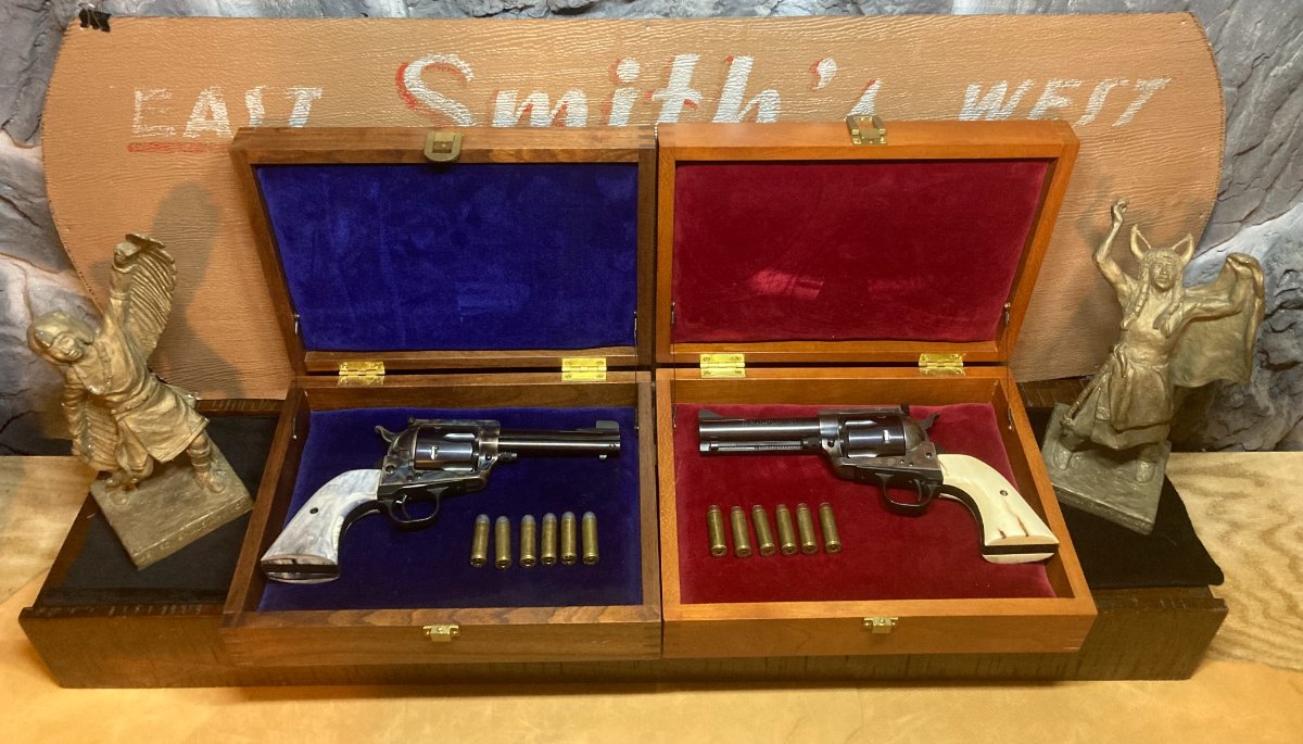 We had a donation this year for the ROCS auction of quite a few display boxes. The first couple went for some big dollars and I cannot wait to see what is done with them as I expect at least one of them will result in a display everyone that attends a future display show will get to enjoy. After the "Big Dogs" were done bidding the auctioneer sold the remainder in one lot, of which I was the winning bid. Taryn tucked them away when we got home in our "future projects" area and they have come up in conversation here and there but nothing solid on what to do with them. Another project from that pile was being utilized tonight and a thought entered my head. There are two dimension matching boxes that I thought just might be a fit for my Bowen flattop 45 Colts. They are almost a perfect fit. Taryn is going to have to work some of her magic on them to make them more form fitting. And before anyone says anything, NO I will not be storing them in the cases.