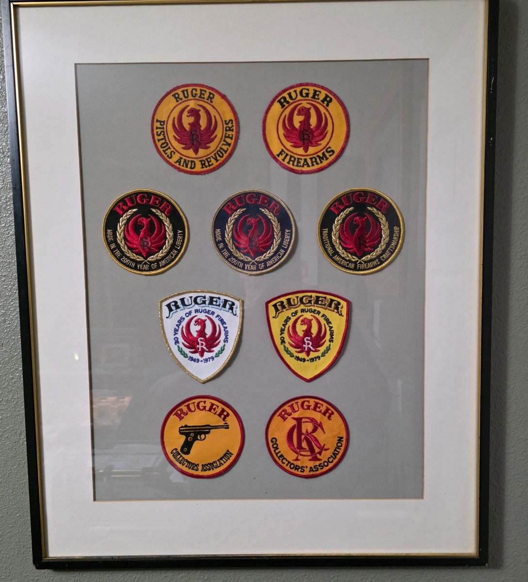 This once hung in James Triggs office now resides in my office. The middle 200th year patch is only one done, it has a dark blue background, the 200th year patch is the common black background. The 30 year patch on the left is only one made in white and the one on the right is the common one.