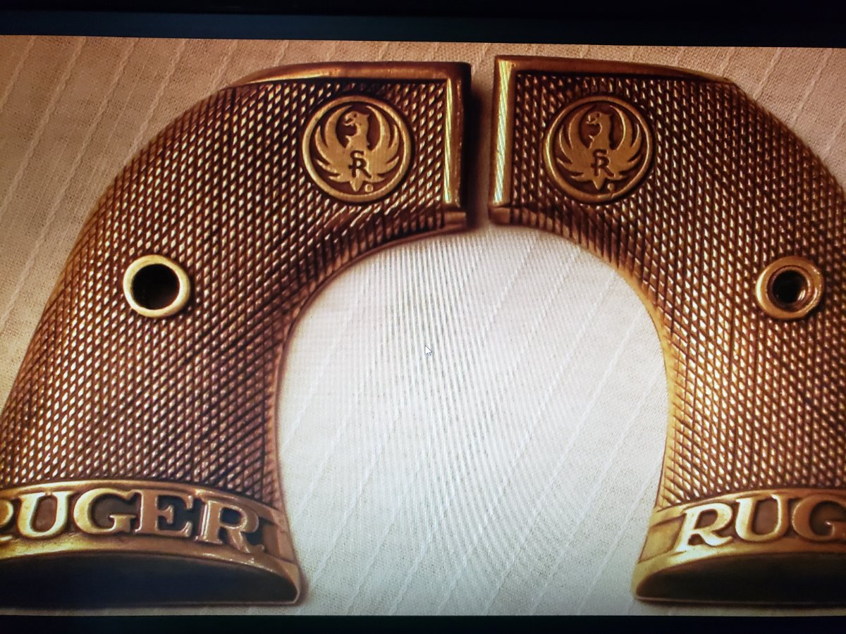 I've had this set of brass grips for a long time. John and I had talked about them years ago he also had a set. When I first got mine I asked Chad about them he gave me a number of a guy who worked at Ruger I just don't remember his name at this time. But I called and the guy on the other end of the phone was very hard of hearing, I asked about the black plastic with the word RUGER on the bottom, he vaguely remembered them then I asked if they did any solid brass ones. He did not remember but his comment back to me was, at pine tree we did all kinds of things and mostlikly we did those. Few weeks later the gentlemen had passed. I only know of two sets of the brass grips.