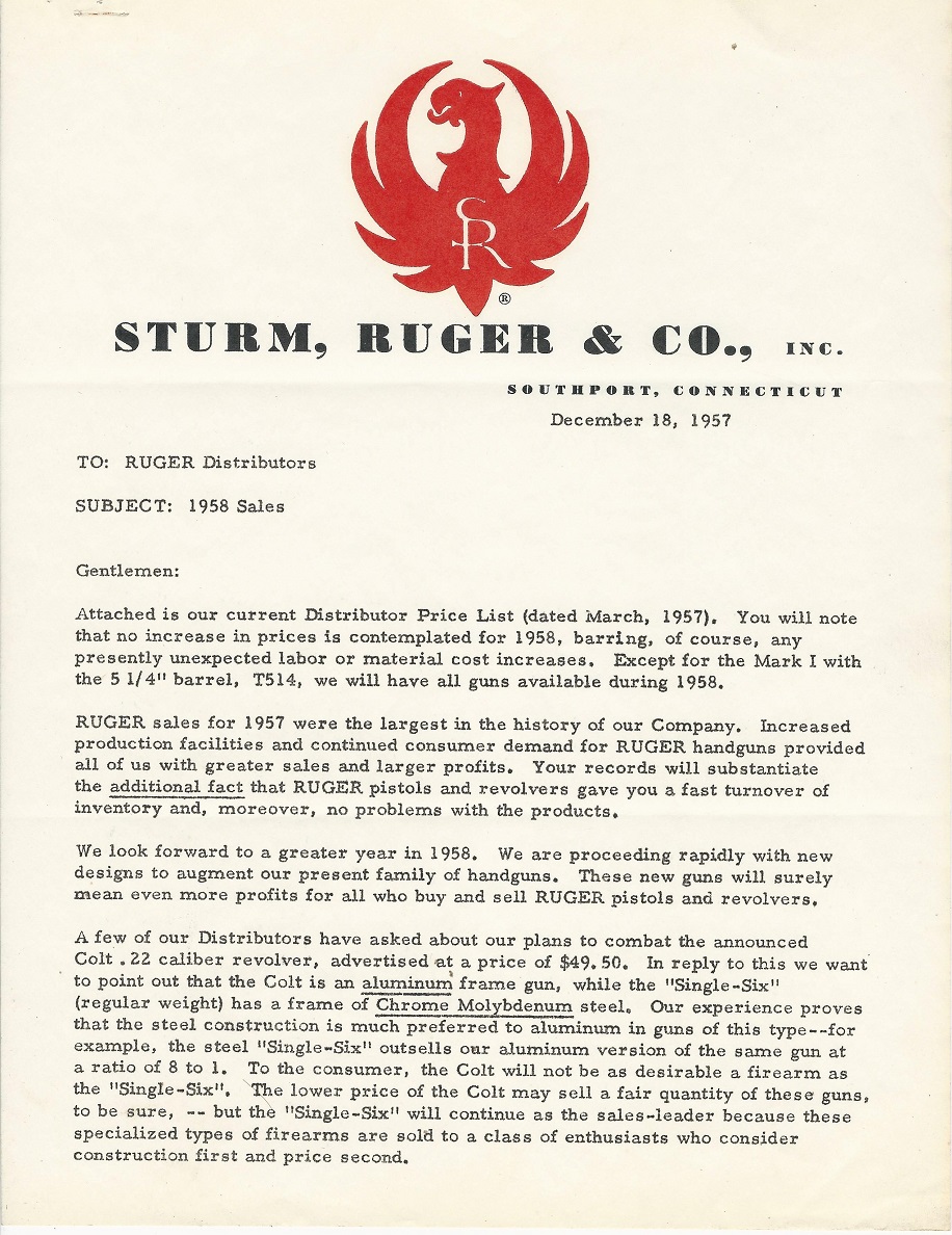 I'm sure Ruger felt Colt was starting to horn into their business again by re-introducing the Peacemaker shortly after Ruger's Blackhawk came out. Then when the aluminum framed Lightweight Single-Six came out in 1956 at $63.25 it was severely outshone by the aluminum framed Colt Scout in 1957 at a $49.50 retail....of course, Colt decided to sell direct (no middle-man distributor system) in order to do that.