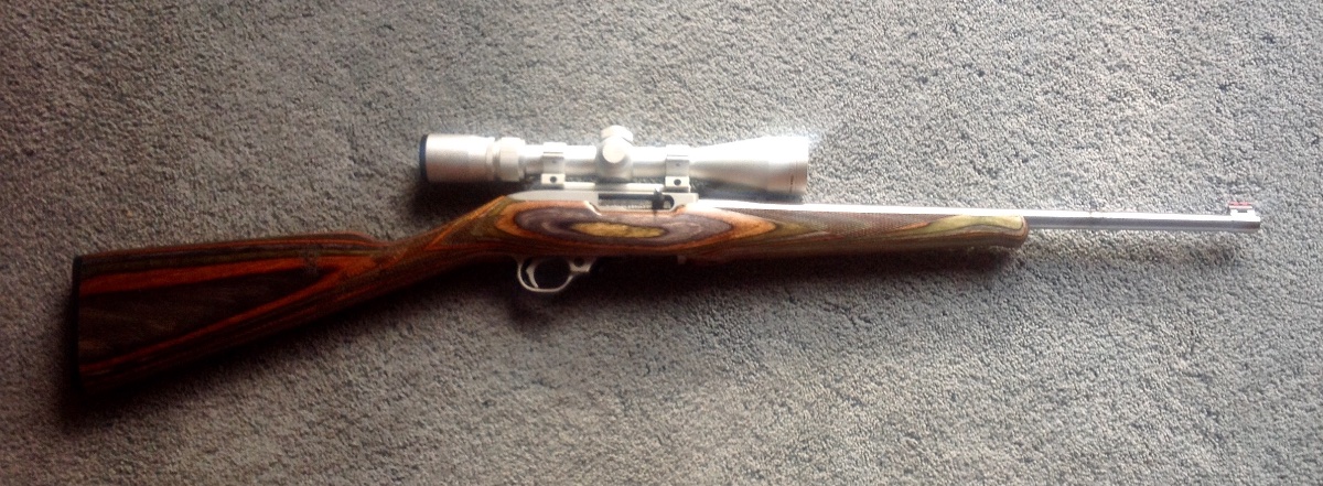 It stainless with a straight laminate wood stock. He said that Ruger hasn't used his stock design yet. It has Chief AJ's name on the barrel and stock. If anyone knows about these please let me know. The Chief said he only built 20 of them. It is the best shooting 22 rifle I have ever fired.