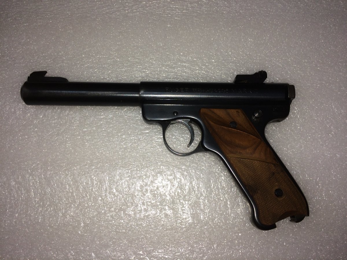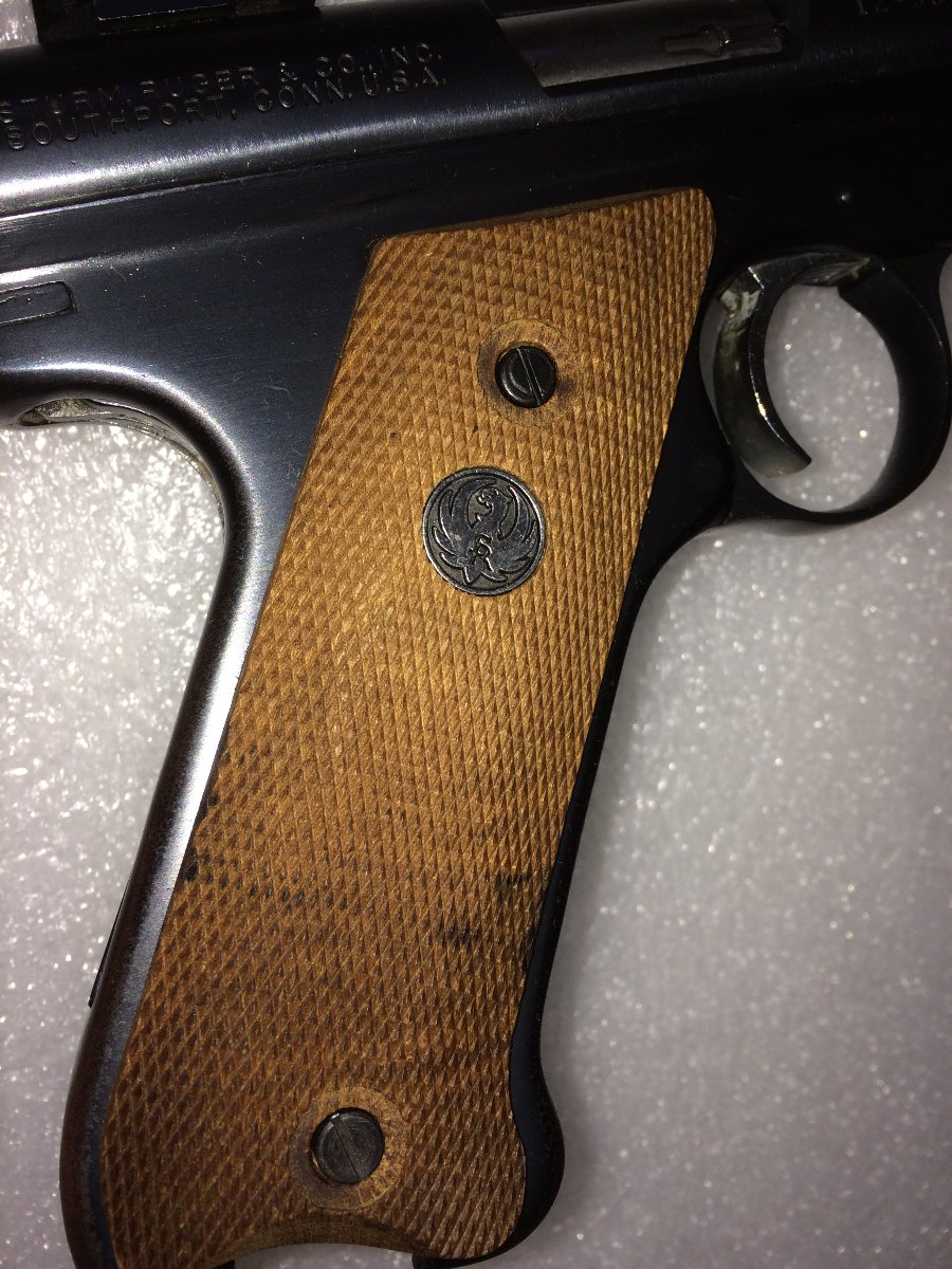 When I received this 1975 T-512W Mark I, it was a sad sight. The grips didn't match and the right panel wasn't factory and missing a screw. It desperately needed a deep cleaning and some TLC as the action had a slightly gritty feel to it. Thanks to Don F. I was able to round up a beautiful set of factory Walnuts w/ thumb rest and a new set of screws. I love the dark band that runs around them at the palm. Thank you, Don! Here she is in the rough.