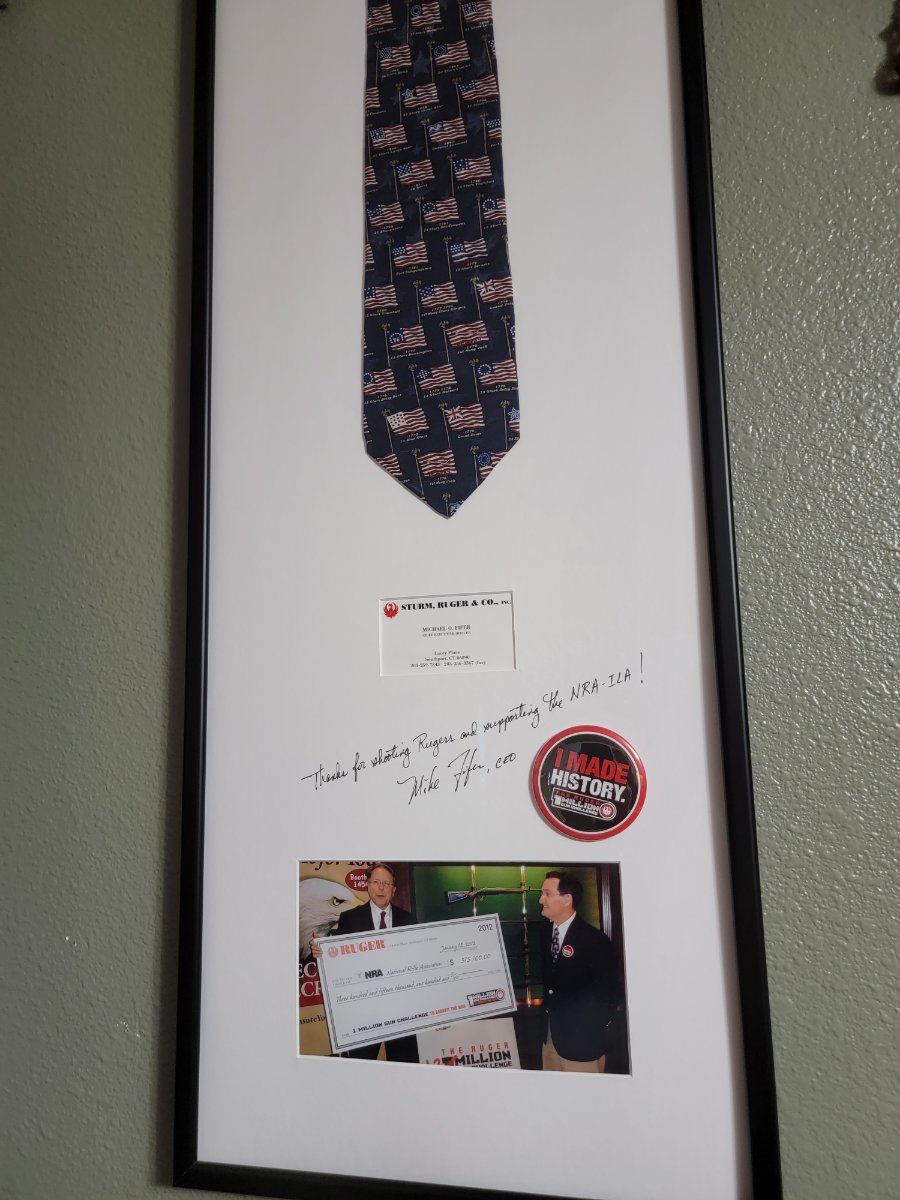 Bennett speaking about ties, this is the tie worn by Mike Fifer when he awarded the check to Wayne LaPierre of the NRA for Rugers million dollar gun challenge.