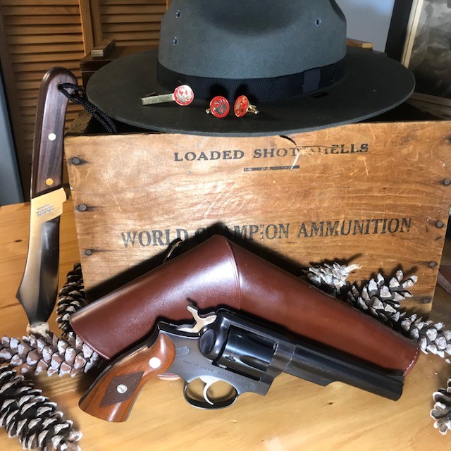 I've enjoyed the posts and history lessons contributed by all on the Ruger RCMP. I've realized through conversation that most of you own a Ruger RCMP or have at one time. Terry, Bill, Chet, thank you for the additional receipts, paperwork and accounting information, I would greatly appreciate an email attachment or snail mail copy of the Gulf States memo. The Red Ruger tie clasp and cuff links were compliments of a deal with Bill, thank you FT44. Honorable mention goes out to Brother Carl the "Watertender" for his contribution to my finding the Ruger RCMP, and as you will see in the photos all things Canadian. Long before he started this thread regarding the Ruger RCMP he had sent me several Canadian items over time. Like many of us do Carl and I exchange and gift each other items we dig up such as books, blades, batons, brassards, holsters, military and engineer items and all things RUGER. I received a Canadian holster from him for the Ruger RCMP with a yellow post-it note (he tags everything) labeling its purpose and use. At the time I thought to my myself hummm nice but I'm not sure what a Ruger RCMP is and it went into the holster pile. He's also a fine blades-man with a grouping of knives for everything from filleting trout, capping African water buffalo or silently working your way through a Taliban checkpoint. He has sent me several fine Canadian Grohmann blades which is one of his go to brands. As an Infantryman my knife drawer was a huge collection of Gerber black synthetic, hack, whack, slice, dice and of course more Gerber multi-tools than any one Soldier could ever need. Needless to say he has cultured my knife assortment and appreciation and I've managed to turn his knife drawer a little darker. The head gear in the photo is from New York also, I don't want to know how he acquired it I believe its a State troopers. I traded him a stick of deer sausage and the bag of marbles he is trying to pass off to Bill. Pierre, you'll have to excuse me and use you imagination on the head gear. I certainly realize its far from an official RCMP uniform piece but I'm short on props and trying to expand my photography skills. Bottom line Gent's RCMP #161-18440 was meant to be as I've been receiving all things Canadian from the Watertender for some time before he posted it here. Thanks Carl,