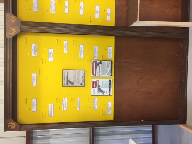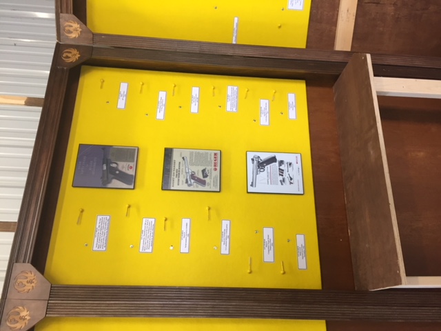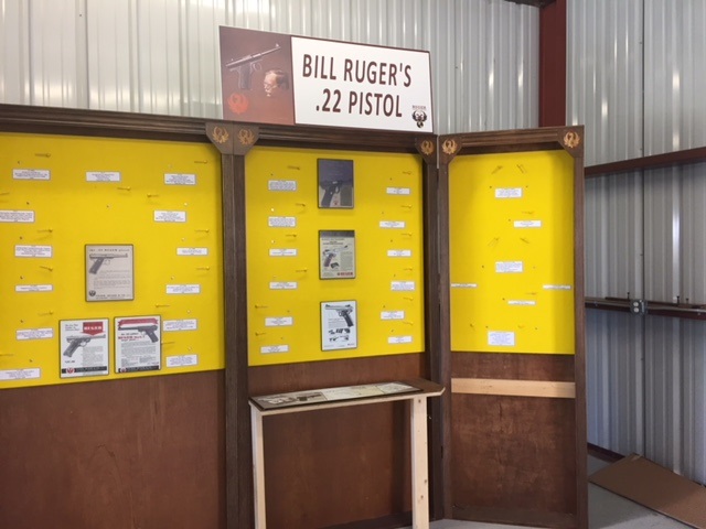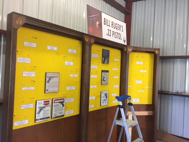 With a lot of help from my friends. The ROCS 2018 NRA display is about finished. If you are anywhere near Dallas, TX on the weekend of May 4-6 stop buy our booth (booth # 10164) and say Hello. The display title is Bill Ruger's .22 Pistols and features Pistols originating from Ruger's original design beginning with the 1st Ruger Firearm shipped (Sept. 15-49) thru the new Mark IV. Here are a few pics of the display, without the guns. Some of the photos are sideways, click on that image for a better view.