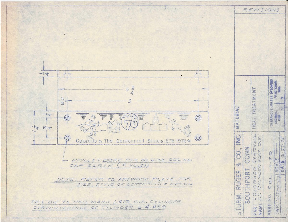 Original blueprint with the actual die for the Colorado Centennial cylinder. Shows details from Colorado "history & lore" as the cylinder was rolled over this die. This is called a flat die.