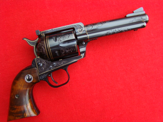 Thought I would share one of my most beautiful .44 Flattops. This Blackhawk .44 Flattop was found with a cut barrel and so I thought it would make a perfect canvas for a master engraver to do his art. My old friend, Master Engraver Ray Viramontez, famous for engraving the "One Millionth Ruger Pistol" and the RCA Chamber seal guns as well as many, many others was contacted. He really did make it into an outstanding and unique work of art! Engraved and gold inlayed, one of my favorites. While its original walnuts pictured are not shabby, after the pics were taken a few years back it was fitted with a great set of ivories, I need to take some fresh pics with them on it too. Hope you like it!!