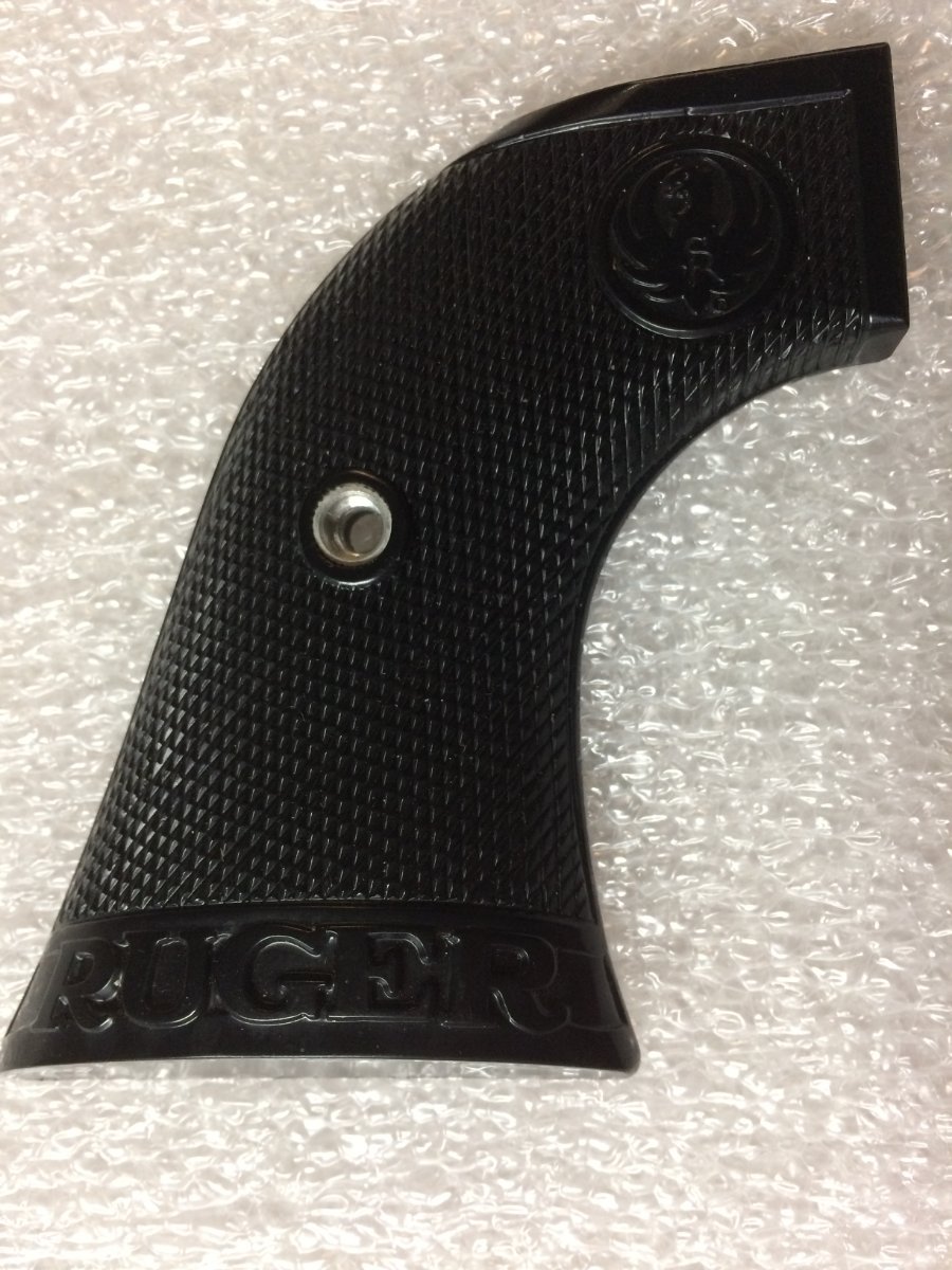 "The first of those were made about 1976 and those were believed to have been black, although several different colors could have come out at that time. One of the old guys at Ruger by the name of Jack Behn would help out at Ruger's display booths at NRA or S.H.O.T. and every once in a while he'd dig certain goodies out of his pocket and give to interested people who visited the booth. Turns out, Jack also had access to the mold and mold material to make those grips so whenever he needed some handouts he'd make more. I've had them in black, gold metal flake (in a yellowish type plastic) and a gray/white swirl. Don't quote me but I think they are also known in red with white swirl and white with red swirl."