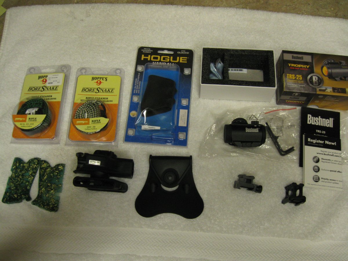 Scope, grips, pic rail stands, holster, bore snakes