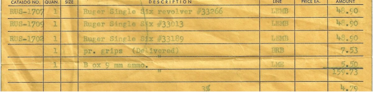 Packing sheet dated February 7, 1956 from Klein"s Sporting Goods, Chicago. Someone removed the name & address of the person who received these guns. I assume the grips were Ruger stag?? (click on image for a closer view)