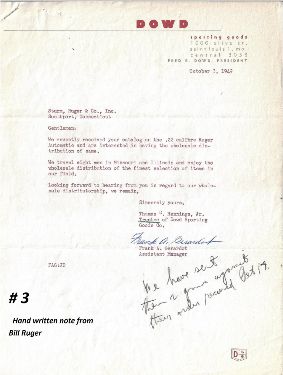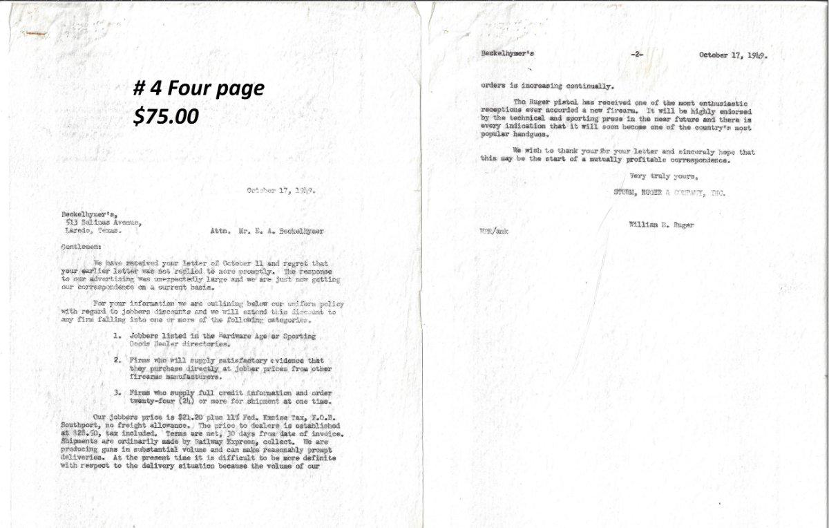 Ruger made a copy of all written correspondence. For sale here are copies of original letters from Ruger responding to requests. 70+ years old, 8 1/2 X 11 papers. If after purchase you are not 100% satisfied return for full refund. Contact direct donfindley806@gmail.com - Numbers 2 & 4 are sold. Thank you!