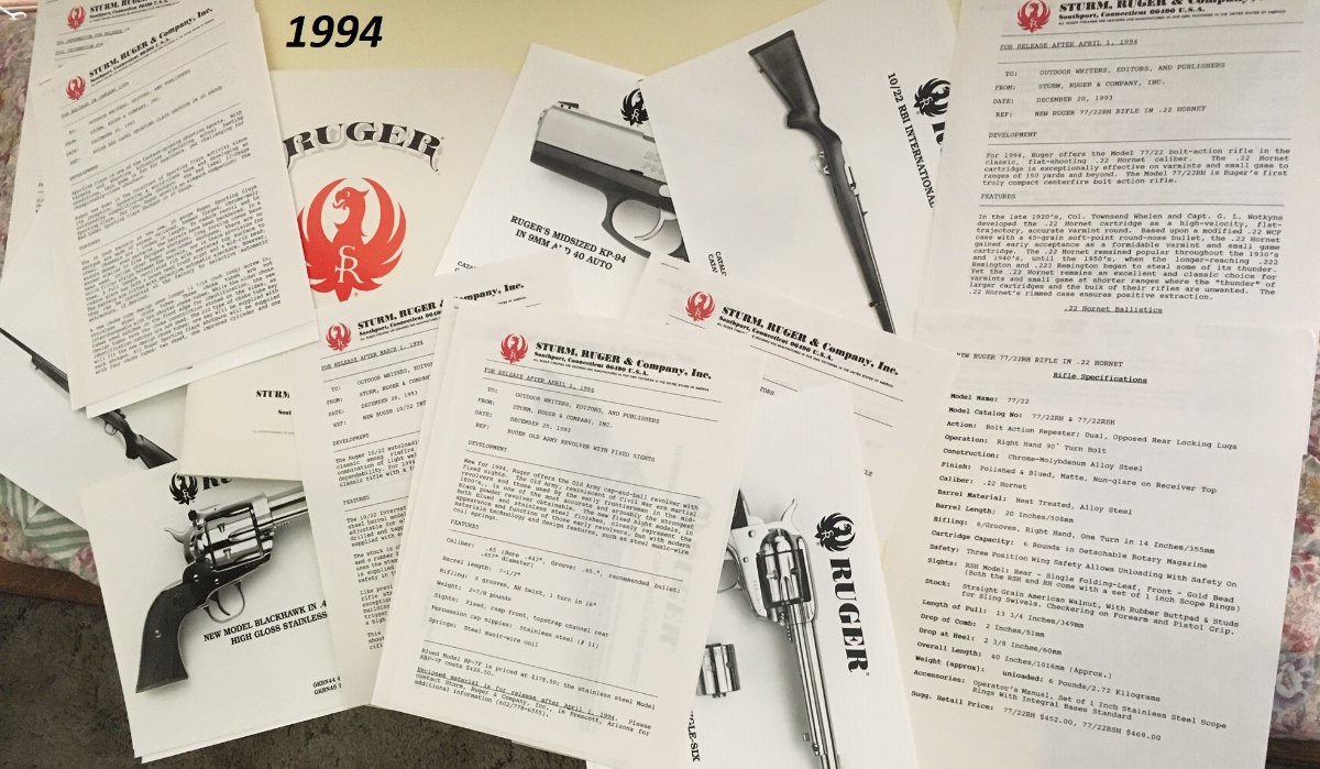 Ruger Press Kits. These were sent to magazine gun writers. They contain 8X10 grossly photos & information on Ruger firearms, etc. This is the stuff you saw in major magazines. Left click for a clearer image. If you are a potential buyer I can send detailed photo attachments to your email. Sorry no texts. $75.00 each. Shipping free. donfindley806@gmail.com 1982 Press Kit SOLD