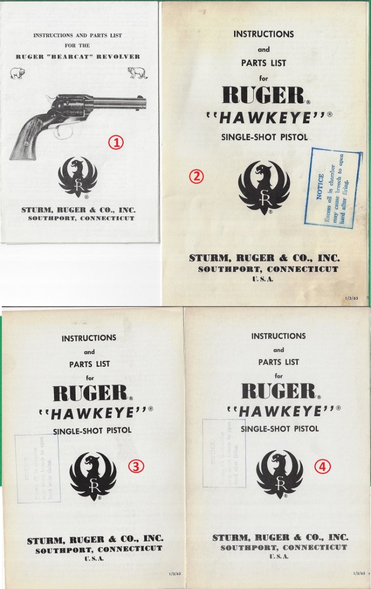 For sale original Ruger Parts & Instruction manuals. If you have a problem with your purchase, send it back for a 100% refund. Small, undated Bearcat (#1) $35.00. Hawkeye (#2 thru #4) $50.00 each. Free shipping. donfindley806@gmail.com