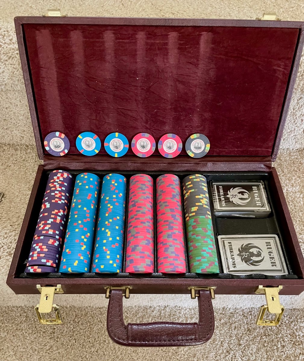 COLLECTOR ITEM: STURM RUGER & CO., INC. LEATHER CASE WITH PLAYING CARDS and POKER CHIPS A rare find! In 1990, firearm company Sturm Ruger & Co. designed and issued a gift set to select employees and distributors. It has been published that only 50 sets were issued. I received this gift from Sturm Ruger as their Northwest Regional Sales Manager at the time. There are 300 poker chips, 4 decks of cards, 2 keys, leather case that locks and a business card from Aces Casino Equipment. The chips and cards have never been used, and the cards still have the plastic wrapping. The poker chips have nice colors and unique design with the RUGER logo.
