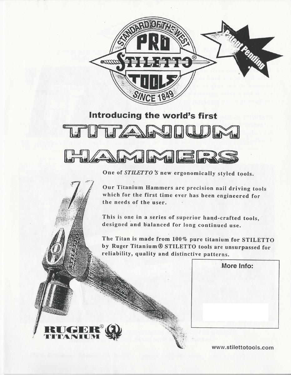 I knew it was worth far more than that, but I deliberated to long and someone else snagged it that day. A week or so later another one showed up in excellent condition with a buy now of $759.00 it sold in less than a week. Stiletto Hammer collectors consider them very rare! I recently scored on a Stiletto/Ruger T-Shirt that I'll take a picture of and post, I think you will like it.
