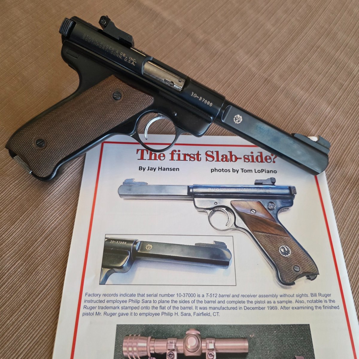 With the new RCA journal arriving to members featured on the back page is the first sample of the slab side barrel. As it reads Mr. Ruger instructed Phillip Sara to plane the sides. Manufactured in December 1969 records show it was shipped to Sara who worked at Ruger in tooling for 40 years until his retirement. Altho it started no sights it did when I became temporary custodian. The receiver is drilled and tapped explaining why it didn't have sights. Mr. Sara of Fairfield CT. Received the gun in January 1970 from Mr. Ruger. Just thought to add information for inquiring minds. It is a very interesting Mark 1.