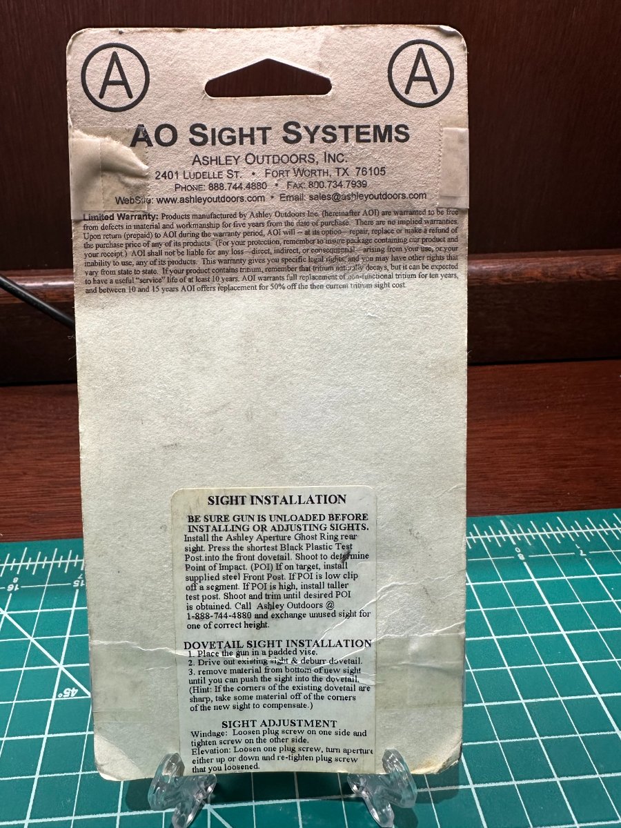 New Old Stock, AO Sight Systems RU-001305 “Ghost Ring Aperture Set” for Ruger Deerfield (44 Carbine). Includes 0.191” and 0.230” apertures, perfect item to add to your Ruger Deerfield collection, or for actual use!