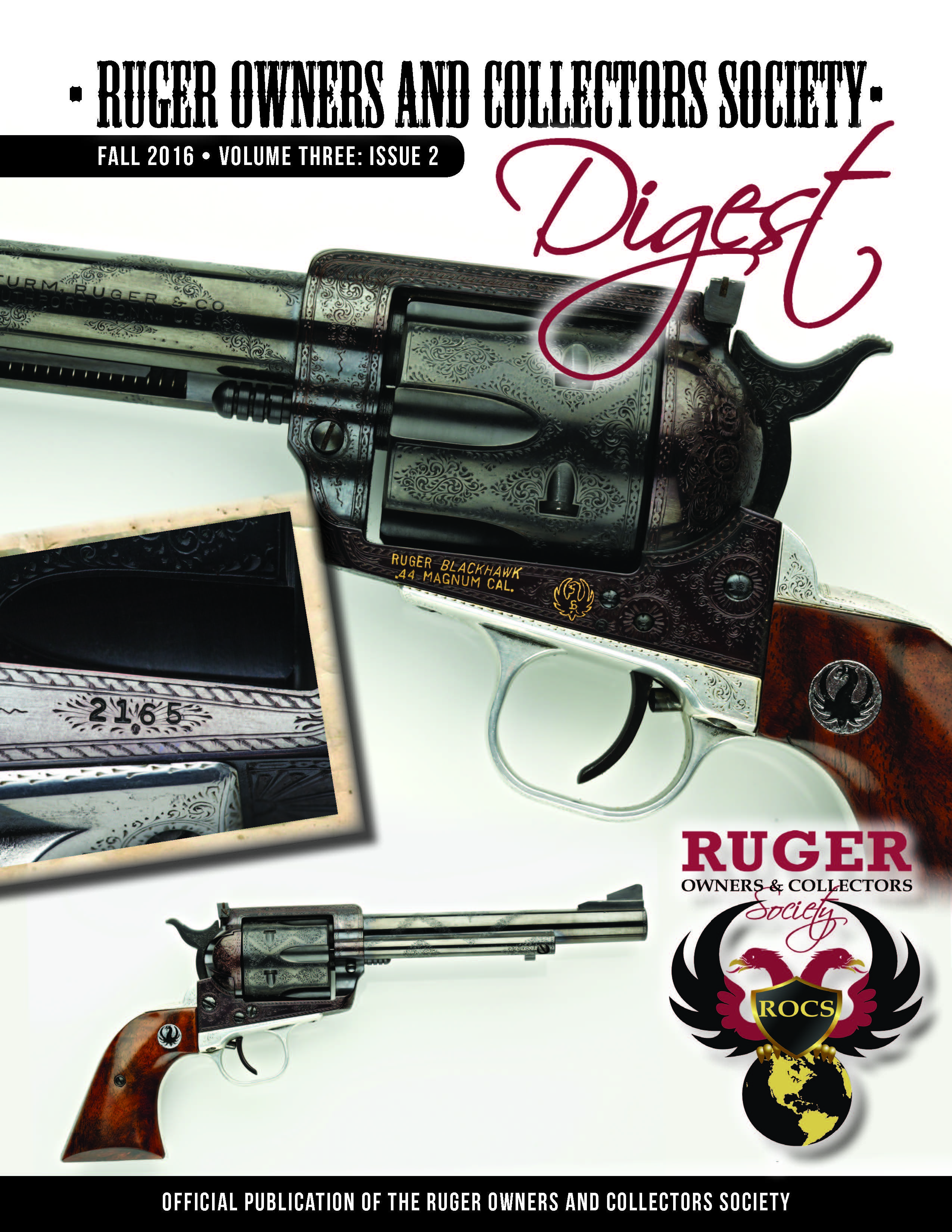 The fall issue of the ROCS Digest is now in the hands of most of our members. Below is a picture of the cover with Bill Ruger, Sr.'s personal Jerred engraved .44 Flattop. This issue is packed full of valuable information on the .44 Flattops and a lot of great articles. If you are not an active ROCS member please join today and receive an issue of the great Digest and others to ciome.